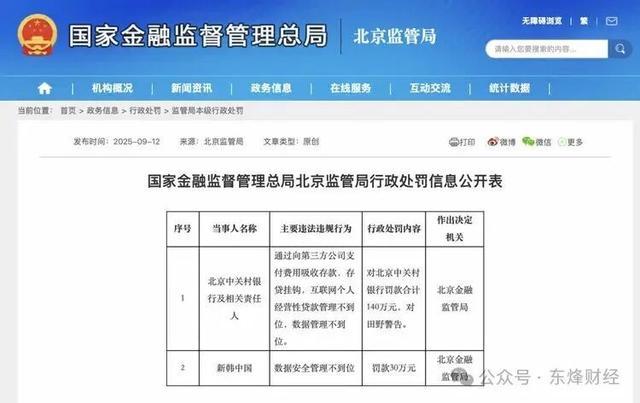 近年来,中关村银行的合规风险持续暴露。2025年9月,中关村银行因向第三方公司支付费用吸收存款、存贷挂钩、互联网个人经营性贷款管理不到位、数据管理不到位等多项违规,被国家金融监督管理总局北京监管局罚款140万元,其中“向第三方公司支付费用吸收存款”在银行业罚单中较为少见,本质是变相高息揽储。此前,中关村银行2023年9月、2022年8月,中关村银行曾因互联网贷款业务区域不符、合作业务管控不到位、个人贷款管理不善等问题受罚。最近4年间,该行已4次被北京金融监管局点名。